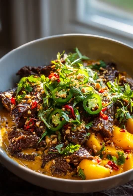 Cremige Erdnusssauce mit Rindfleisch, Pilzen & Mangosalsa