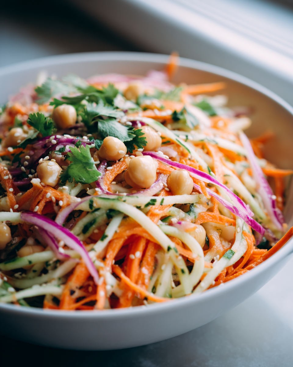 Asian Cucumber And Chickpea Slaw With Sesame Dressing – dieses Gericht ist eine wahre Geschmacksexplosion, die Frische, Textur und aromatische Tiefe in einer einzigen Schüssel vereint. Vergessen Sie schwere Beilagen; dieser lebendige Slaw bietet eine erfrischende und sättigende Alternative, die perfekt zu gegrilltem Rindfleisch oder als leichte, proteinreiche Hauptmahlzeit passt. Knackige, kühle Gurkenscheiben treffen auf herzhafte Kichererbsen, die diesem Salat eine angenehme Substanz und Biss verleihen. Doch der wahre Star ist das unwiderstehliche Sesam-Dressing: eine harmonische Mischung aus geröstetem Sesamöl, Sojasauce, Reisessig und einem Hauch Süße, die jede Zutat umhüllt und eine unwiderstehlich nussig-umami Note hinterlässt. Es ist eine Hommage an die leichte, gesunde und geschmackvolle asiatische Küche, die Ihre Sinne belebt und Sie mit jedem Bissen begeistert. Perfekt für ein leichtes Mittagessen, ein Picknick oder als farbenfrohe und nahrhafte Beilage zu Ihren Lieblingsgerichten.