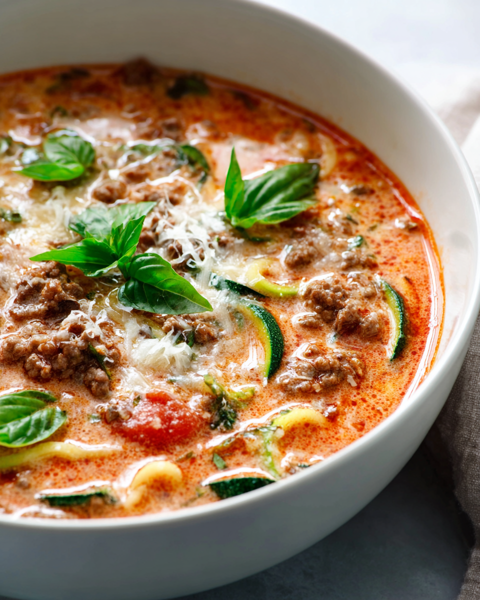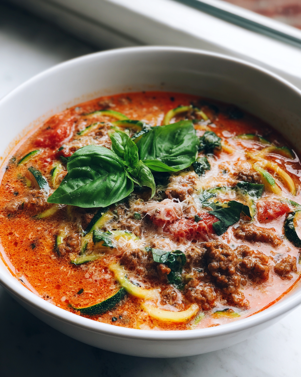 Diese Low Carb Lasagne Suppe mit Zucchini-Nudeln vereint den herzhaften Geschmack klassischer Lasagne in einer köstlichen Suppe. Ideal für eine bewusste Ernährung, ohne auf Genuss zu verzichten!